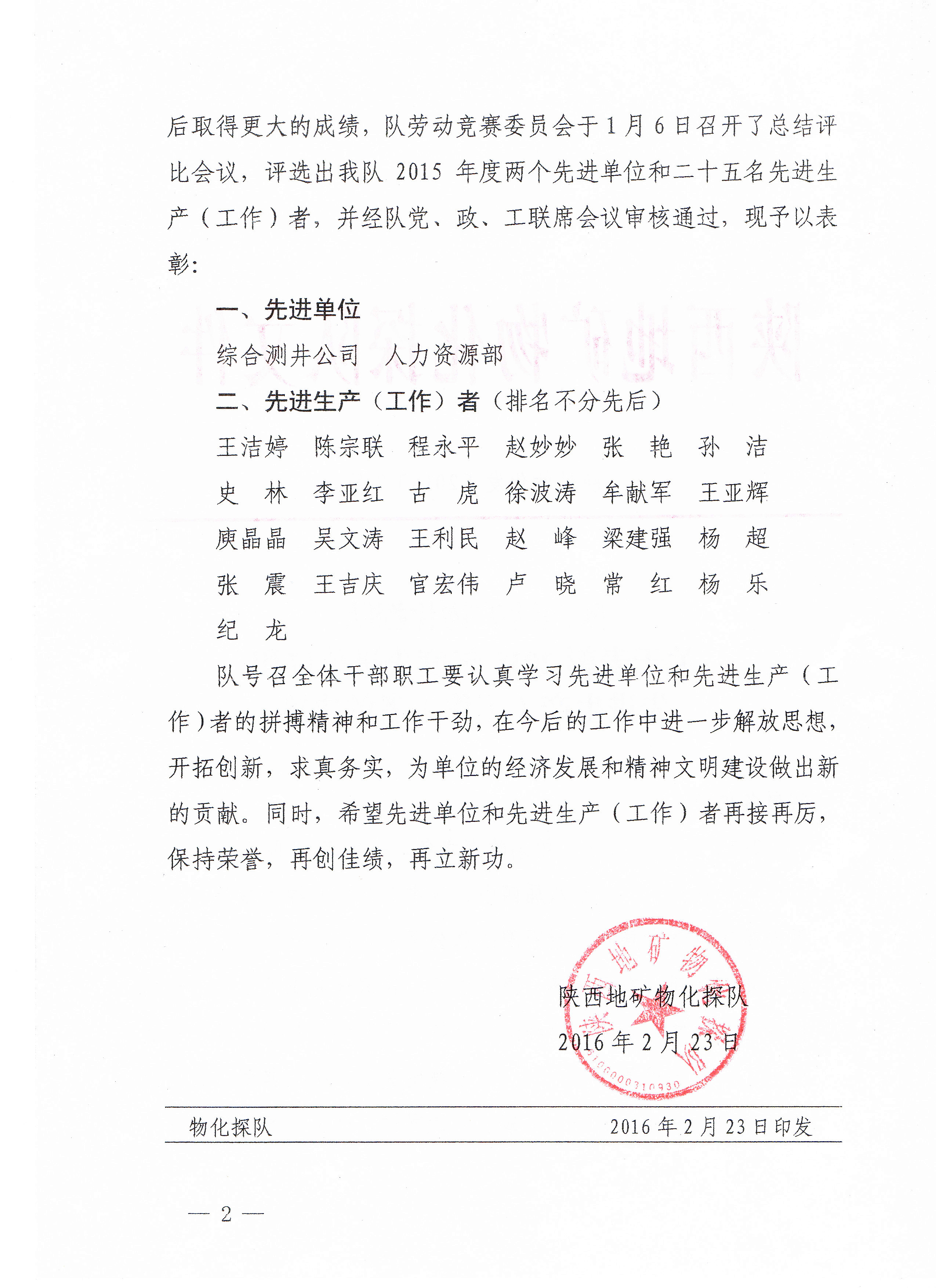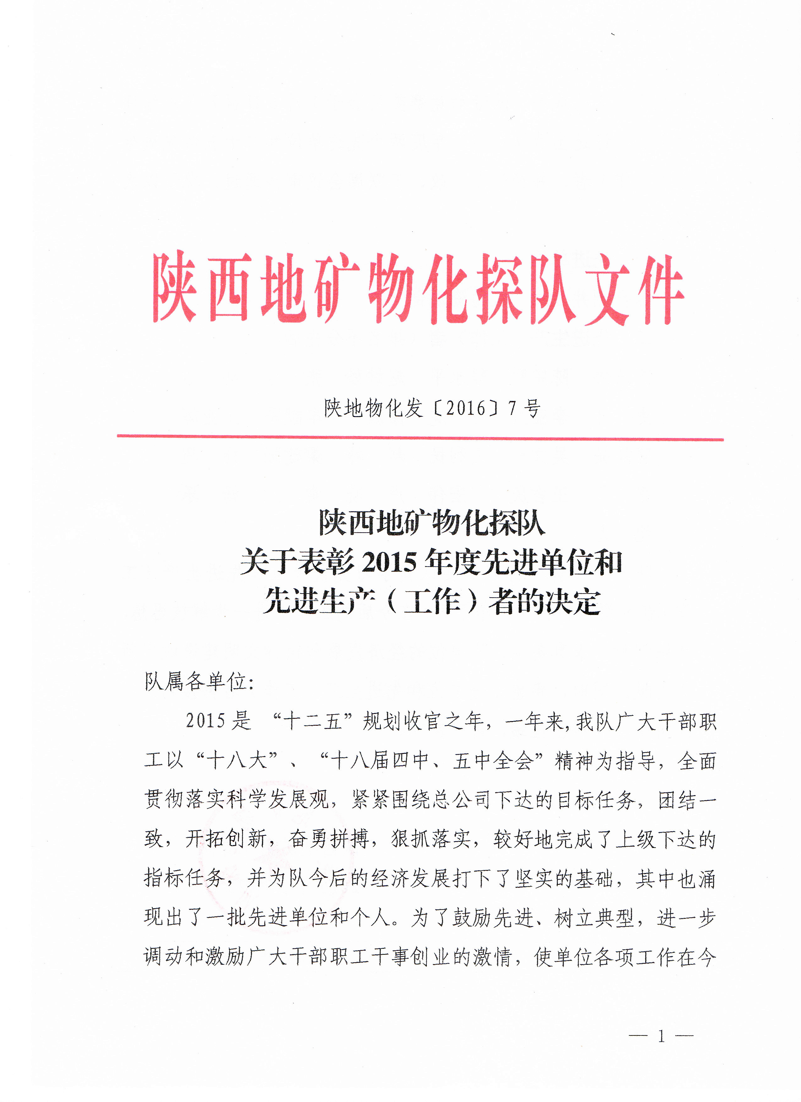 關于表彰2015年度先進單位和先進生產(工作)者的決定